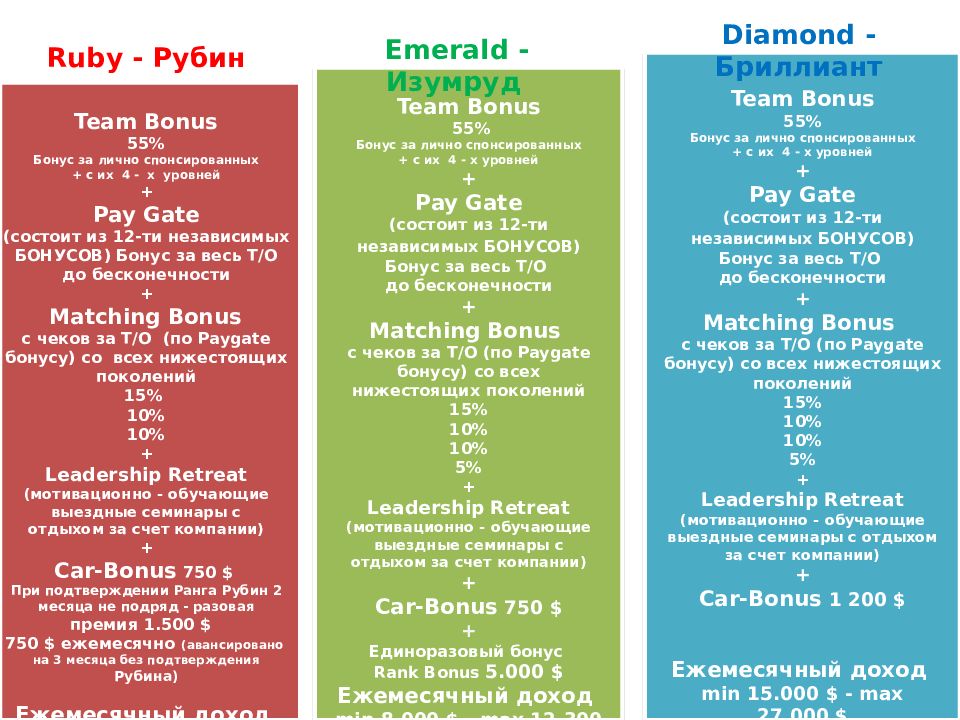 Ruby - Рубин Emerald - Изумруд Team Bonus 5 5% Бонус за лично спонсированных + с их 4 - х уровней + Pay Gate (состоит из 12-ти независимых БОНУСОВ) Бонус за весь Т/О до бесконечности + Matching Bonus с чеков за Т/О (по Paygate бонусу) со всех нижестоящих поколений 15 % 10% 10 % + Leadership Retreat (мотивационно - обучающие выездные семинары с отдыхом за счет компании) + Car-Bonus 750 $ При подтверждении Ранга Рубин 2 месяца не подряд - разовая премия 1.500 $ 750 $ ежемесячно (авансировано на 3 месяца без подтверждения Рубина) Ежемесячный доход min 2.700 $ - max 7.000 $ Team Bonus 5 5% Бонус за лично спонсированных + с их 4 - х уровней + Pay Gate (состоит из 12-ти независимых БОНУСОВ) Бонус за весь Т/О до бесконечности + Matching Bonus с чеков за Т/О (по Paygate бонусу) со всех нижестоящих поколений 15 % 10% 10% 5 % + Leadership Retreat (мотивационно - обучающие выездные семинары с отдыхом за счет компании) + Car-Bonus 750 $ + Единоразовый бонус Rank Bonus 5.000 $ Ежемесячный доход min 8.000 $ - max 12.300 $ Team Bonus 5 5% Бонус за лично спонсированных + с их 4 - х уровней + Pay Gate (состоит из 12-ти независимых БОНУСОВ) Бонус за весь Т/О до бесконечности + Matching Bonus с чеков за Т/О (по Paygate бонусу) со всех нижестоящих поколений 15 % 10% 10% 5 % + Leadership Retreat (мотивационно - обучающие выездные семинары с отдыхом за счет компании) + Car-Bonus 1 200 $ Ежемесячный доход min 15.000 $ - max 2 7.000 $ Diamond - Бриллиант