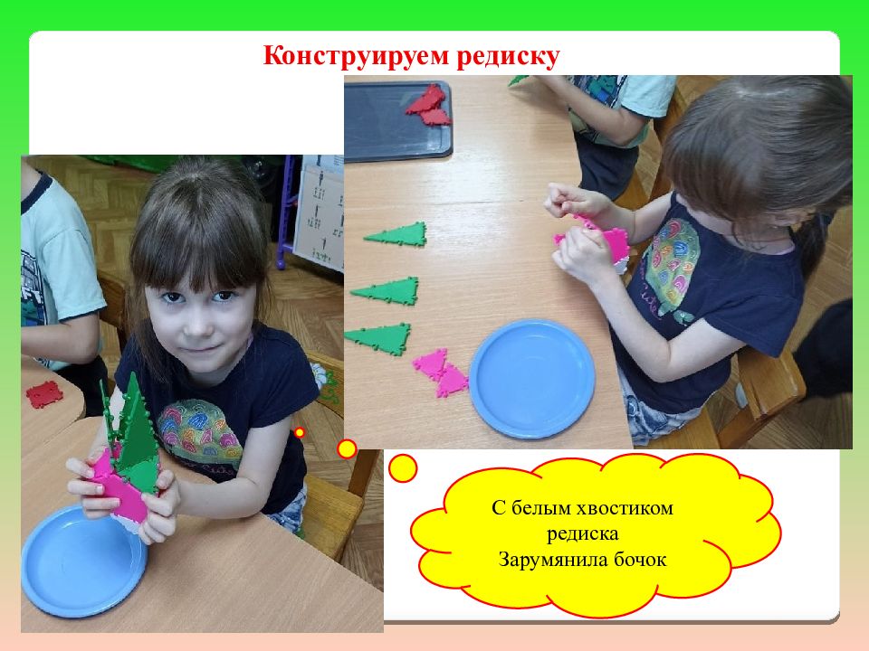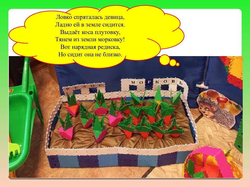 Ловко спряталась девица, Ладно ей в земле сидится. Выдаёт коса плутовку, Тянем из земли морковку ! Вот нарядная редиска, Но сидит она не близко.