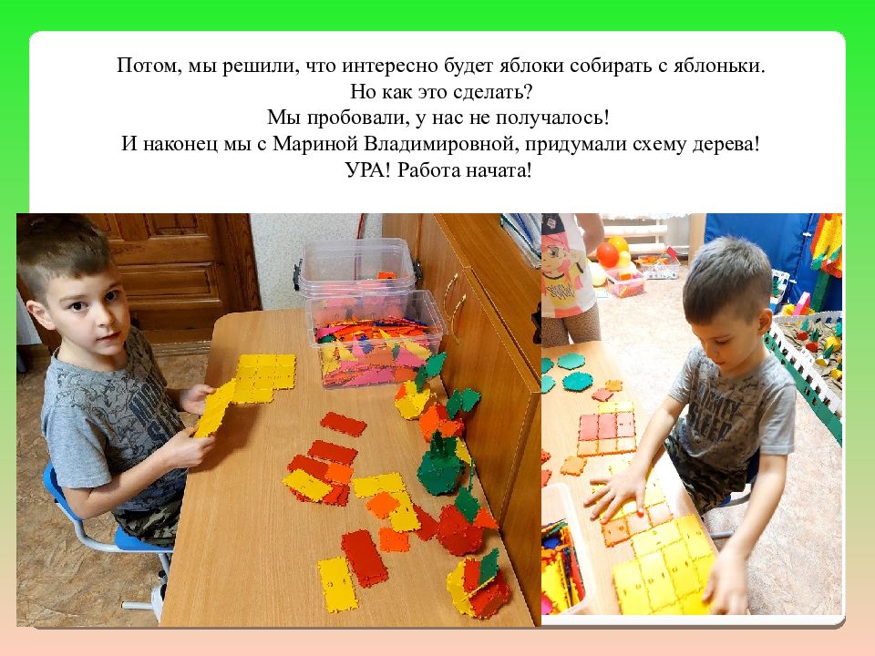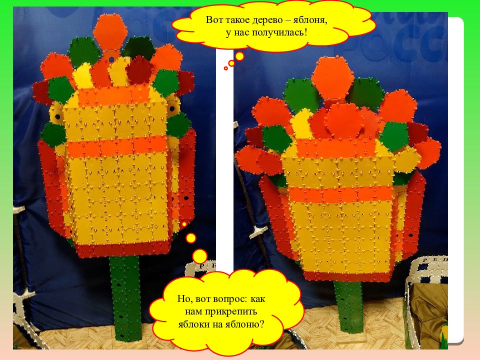 Потом, мы решили, что интересно будет яблоки собирать с яблоньки. Но как это сделать? Мы пробовали, у нас не получалось! И наконец мы с Мариной Владимировной, придумали схему дерева! УРА! Работа начата!