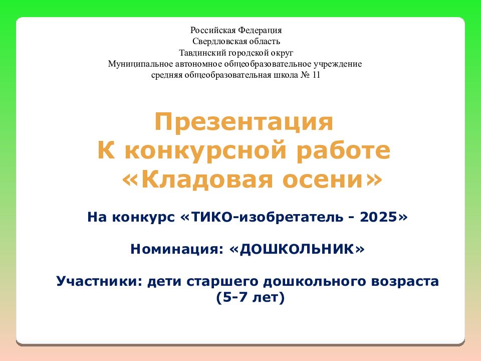 Презентация К конкурсной работе «Кладовая осени» На конкурс «ТИКО-изобретатель - 2025» Номинация: «ДОШКОЛЬНИК» Участники: дети старшего дошкольного возраста (5-7 лет) Российская Федерация Свердловская область Тавдинский городской округ Муниципальное автономное общеобразовательное учреждение средняя общеобразовательная школа № 11