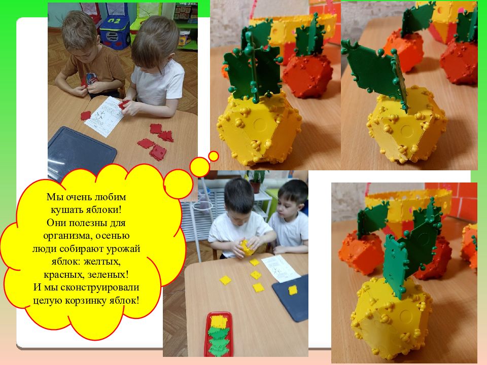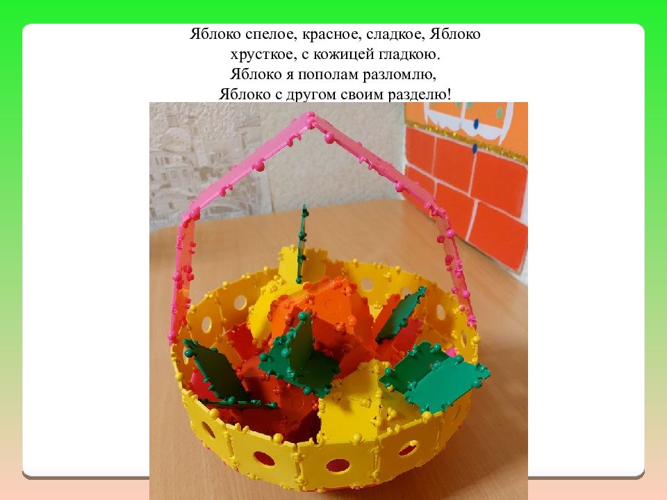 Мы очень любим кушать яблоки! Они полезны для организма, осенью люди собирают урожай яблок: желтых, красных, зеленых! И мы сконструировали целую корзинку яблок!