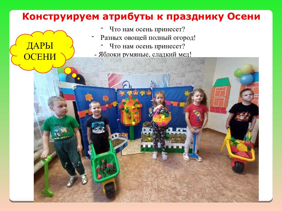 Конструируем атрибуты к празднику Осени Что нам осень принесет? Разных овощей полный огород! Что нам осень принесет? - Яблоки румяные, сладкий мед ! ! ДАРЫ ОСЕНИ