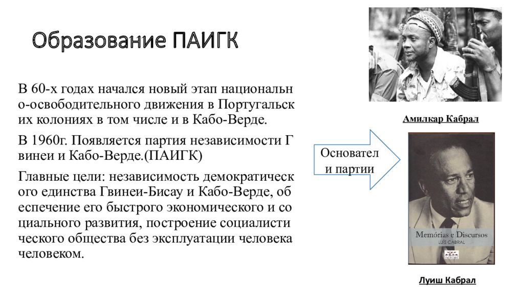 В 60-х годах начался новый этап национально-освободительного движения в Португальских колониях в том числе и в Кабо-Верде. В 1960г. Появляется партия независимости Гвинеи и Кабо-Верде.(ПАИГК) Главные цели: независимость демократического единства Гвинеи-Бисау и Кабо-Верде, обеспечение его быстрого экономического и социального развития, построение социалистического общества без эксплуатации человека человеком. Амилкар Кабрал Луиш Кабрал Основатели партии