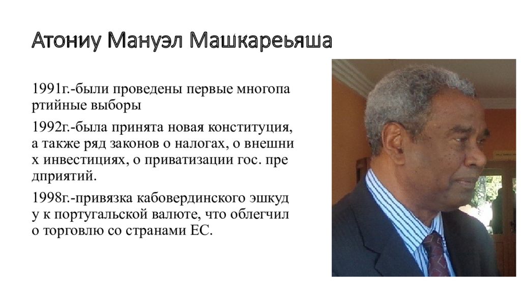1991г.-были проведены первые многопартийные выборы 1992г.-была принята новая конституция, а также ряд законов о налогах, о внешних инвестициях, о приватизации гос. предприятий. 1998г.-привязка кабовердинского эшкуду к португальской валюте, что облегчило торговлю со странами ЕС.