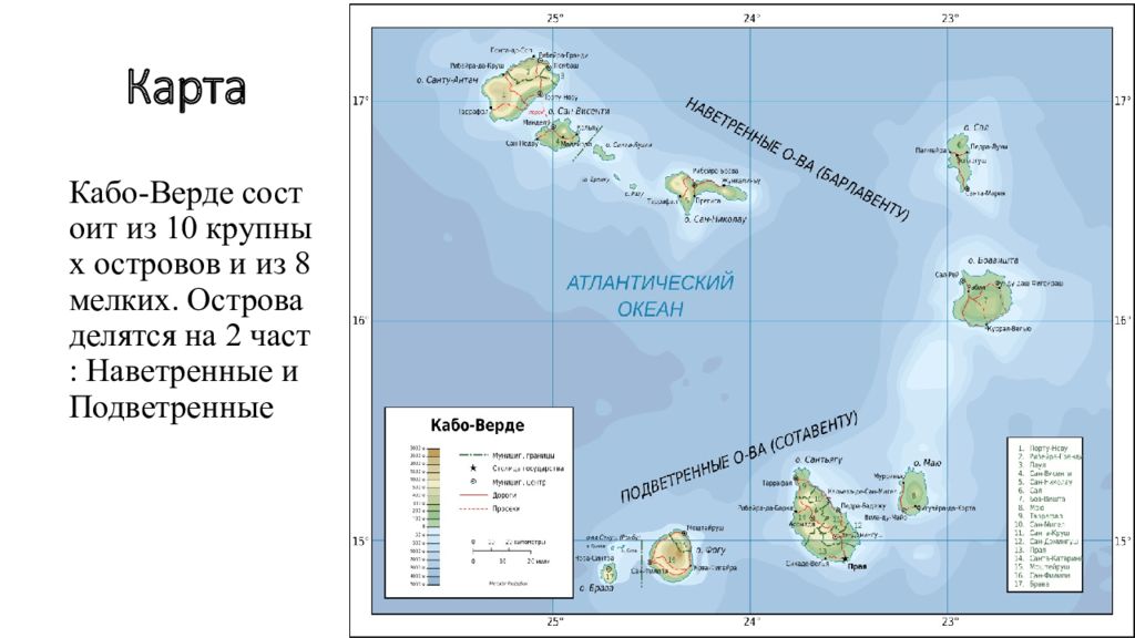 Кабо-Верде состоит из 10 крупных островов и из 8 мелких. Острова делятся на 2 част: Наветренные и Подветренные