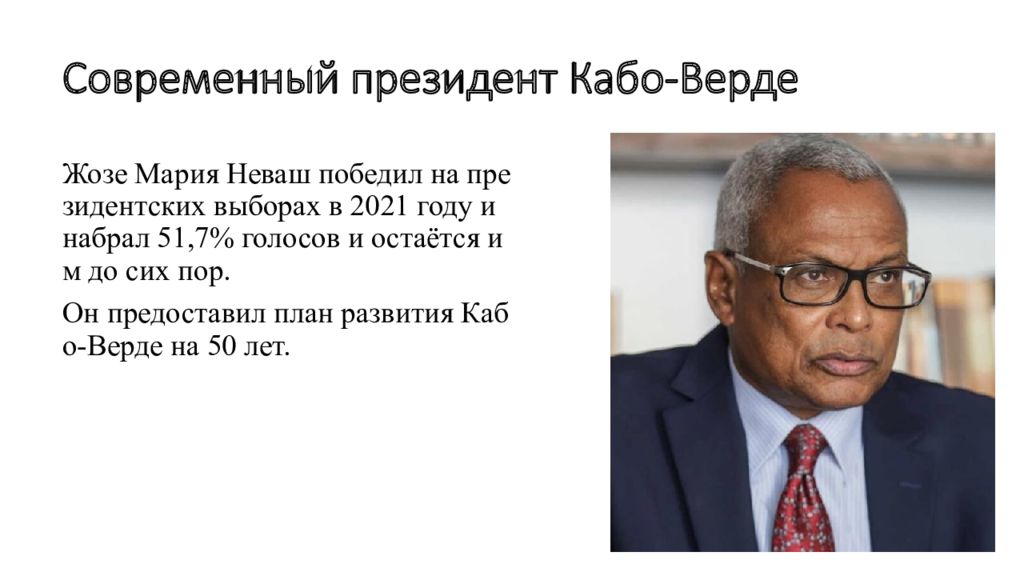 Жозе Мария Неваш победил на президентских выборах в 2021 году и набрал 51,7% голосов и остаётся им до сих пор. Он предоставил план развития Кабо-Верде на 50 лет.