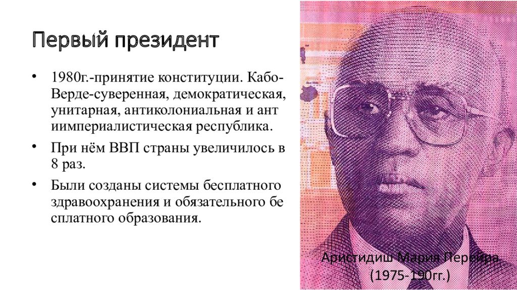 1980г.-принятие конституции. Кабо-Верде-суверенная, демократическая, унитарная, антиколониальная и антиимпериалистическая республика. При нём ВВП страны увеличилось в 8 раз. Были созданы системы бесплатного здравоохранения и обязательного бесплатного образования. Аристидиш Мария Перейра (1975-190гг.)