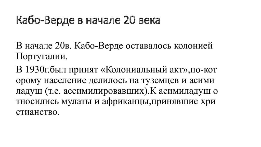 В начале 20в. Кабо-Верде оставалось колонией Португалии. В 1930г.был принят «Колониальный акт»,по -которому население делилось на туземцев и асимиладуш (т.е. ассимилировавших).К асимиладуш относились мулаты и африканцы,принявшие христианство.