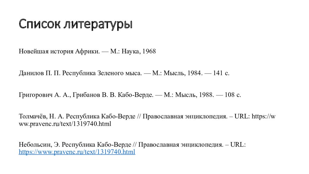 Новейшая история Африки. — М.: Наука, 1968 Данилов П. П. Республика Зеленого мыса. — М.: Мысль, 1984. — 141 с. Григорович А. А., Грибанов В. В. Кабо-Верде. — М.: Мысль, 1988. — 108 с. Толмачёв, Н. А. Республика Кабо-Верде // Православная энциклопедия. – URL: https://www.pravenc.ru/text/1319740.html Небольсин, Э. Республика Кабо-Верде // Православная энциклопедия. – URL: https://www.pravenc.ru/text/1319740.html