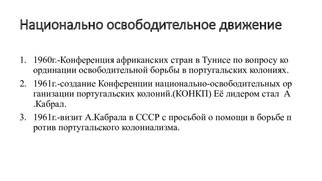 1960г.-Конференция африканских стран в Тунисе по вопросу координации освободительной борьбы в португальских колониях. 1961г.-создание Конференции национально-освободительных организации португальских колоний.(КОНКП) Её лидером стал А.Кабрал. 1961г.-визит А.Кабрала в СССР с просьбой о помощи в борьбе против португальского колониализма.