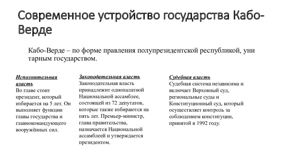 Кабо-Верде – по форме правления полупрезидентской республикой, унитарным государством. Исполнительная власть Во главе стоит президент, который избирается на 5 лет. Он выполняет функции главы государства и главнокомандующего вооружённых сил. Законодательная власть Законодательная власть принадлежит однопалатной Национальной ассамблее, состоящей из 72 депутатов, которые также избираются на пять лет. Премьер-министр, глава правительства, назначается Национальной ассамблеей и утверждается президентом. Судебная власть Судебная система независима и включает Верховный суд, региональные суды и Конституционный суд, который осуществляет контроль за соблюдением конституции, принятой в 1992 году.