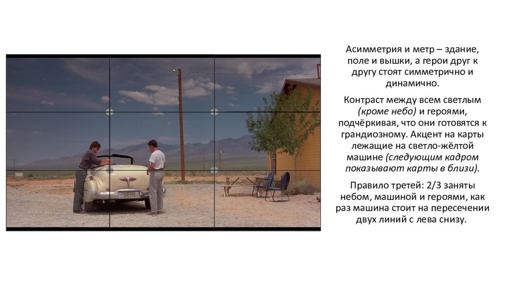 Асимметрия и метр – здание, поле и вышки, а герои друг к другу стоят симметрично и динамично. Контраст между всем светлым (кроме небо) и героями, подчёркивая, что они готовятся к грандиозному. Акцент на карты лежащие на светло-жёлтой машине (следующим кадром показывают карты в близи). Правило третей: 2/3 заняты небом, машиной и героями, как раз машина стоит на пересечении двух линий с лева снизу.