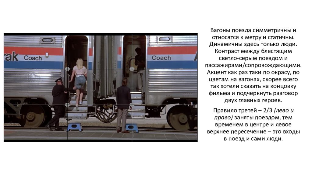Вагоны поезда симметричны и относятся к метру и статичны. Динамичны здесь только люди. Контраст между блестящим светло-серым поездом и пассажирами/сопровождающими. Акцент как раз таки по окрасу, по цветам на вагонах, скорее всего так хотели сказать на концовку фильма и подчеркнуть разговор двух главных героев. Правило третей – 2/3 (лево и право) заняты поездом, тем временем в центре и левое верхнее пересечение – это входы в поезд и сами люди.