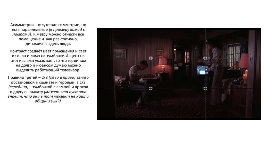 Асимметрия – отсутствие симметрии, но есть параллельные (к примеру комод с лампами). К метру можно отнести всё помещение и как раз статично, динамичны здесь люди. Контраст создаёт цвет помещения и свет из окон и ламп на тумбочке. Акцент на свет из ламп указывает, то что герои там на долго и нюансом думаю можно выделить работающий телевизор. Правило третей – 2/3 (лево и право) занято обстановкой в комнате и героями, а 1/3 (середина) – тумбочкой с лампой и проход в другую комнату (может эта пустота значит, что они в тот момент не нашли общий язык?).