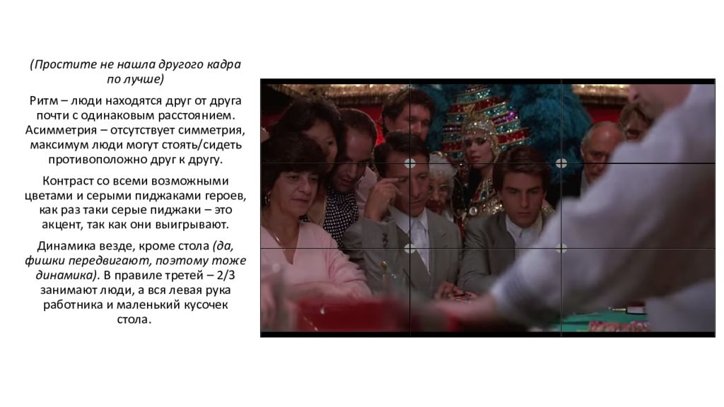 (Простите не нашла другого кадра по лучше) Ритм – люди находятся друг от друга почти с одинаковым расстоянием. Асимметрия – отсутствует симметрия, максимум люди могут стоять/сидеть противоположно друг к другу. Контраст со всеми возможными цветами и серыми пиджаками героев, как раз таки серые пиджаки – это акцент, так как они выигрывают. Динамика везде, кроме стола (да, фишки передвигают, поэтому тоже динамика). В правиле третей – 2/3 занимают люди, а вся левая рука работника и маленький кусочек стола.