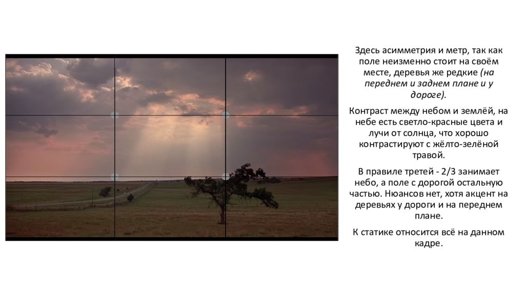 Здесь асимметрия и метр, так как поле неизменно стоит на своём месте, деревья же редкие (на переднем и заднем плане и у дороге). Контраст между небом и землёй, на небе есть светло-красные цвета и лучи от солнца, что хорошо контрастируют с жёлто-зелёной травой. В правиле третей - 2/3 занимает небо, а поле с дорогой остальную частью. Нюансов нет, хотя акцент на деревьях у дороги и на переднем плане. К статике относится всё на данном кадре.