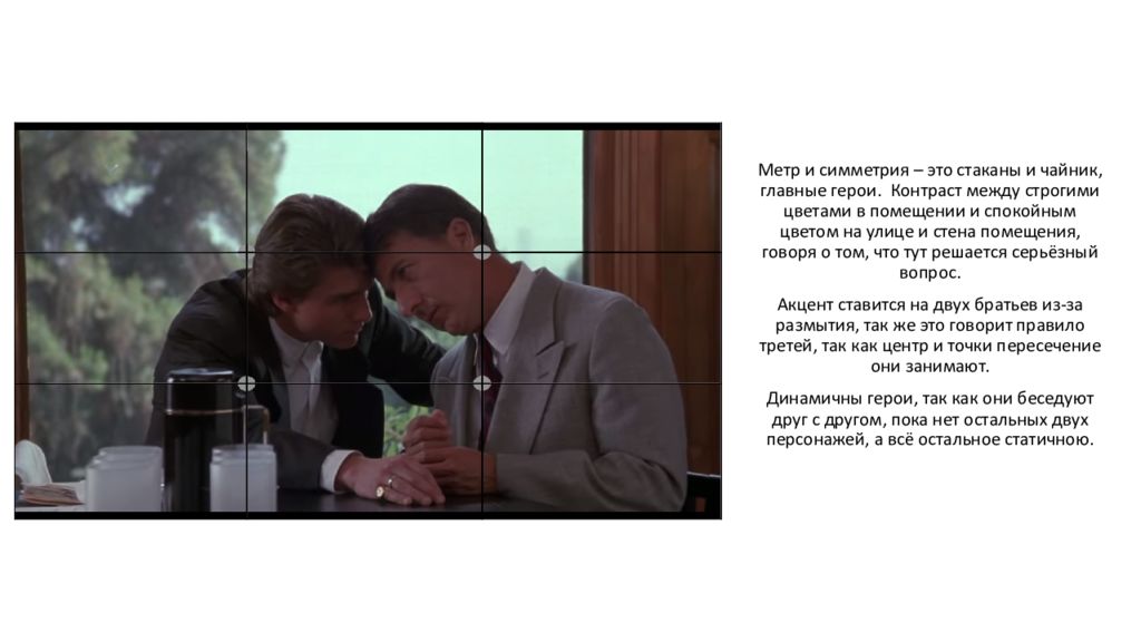 Метр и симметрия – это стаканы и чайник, главные герои. Контраст между строгими цветами в помещении и спокойным цветом на улице и стена помещения, говоря о том, что тут решается серьёзный вопрос. Акцент ставится на двух братьев из-за размытия, так же это говорит правило третей, так как центр и точки пересечение они занимают. Динамичны герои, так как они беседуют друг с другом, пока нет остальных двух персонажей, а всё остальное статичною.