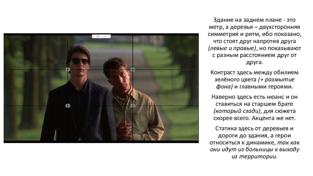 Здание на заднем плане - это метр, а деревья – двухсторонняя симметрия и ритм, ибо показано, что стоят друг напротив друга (левые и правые), но показывают с разным расстоянием друг от друга. Контраст здесь между обилием зелёного цвета (+ размытие фона) и главными героями. Наверно здесь есть нюанс и он ставиться на старшем брате (который сзади), для сюжета скорее всего. Акцента же нет. Статика здесь от деревьев и дороги до здания, а герои относиться к динамике, так как они идут из больницы к выходу из территории.