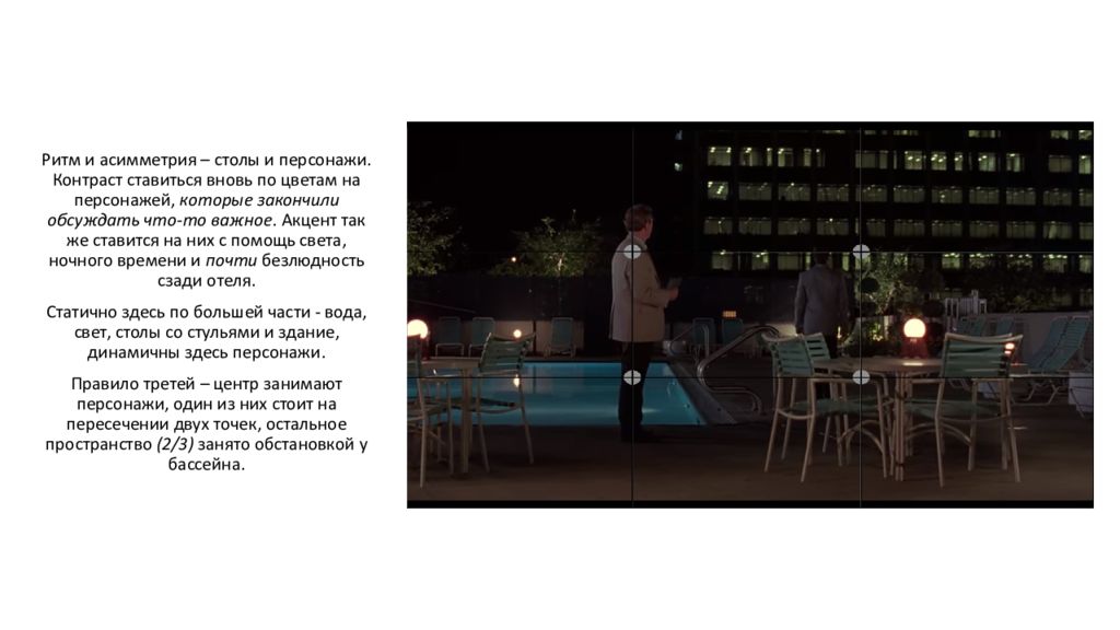 Ритм и асимметрия – столы и персонажи. Контраст ставиться вновь по цветам на персонажей, которые закончили обсуждать что-то важное. Акцент так же ставится на них с помощь света, ночного времени и почти безлюдность сзади отеля. Статично здесь по большей части - вода, свет, столы со стульями и здание, динамичны здесь персонажи. Правило третей – центр занимают персонажи, один из них стоит на пересечении двух точек, остальное пространство (2/3) занято обстановкой у бассейна.