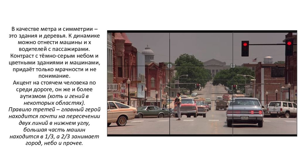 В качестве метра и симметрии – это здания и деревья. К динамике можно отнести машины и х водителей с пассажирами. Контраст с тёмно-серым небом и цветными зданиями и машинами, придаёт только мрачности и не понимание. Акцент на стоячем человека по среди дороге, он же и более аутизмом (хоть и гений в некоторых областях). Правило третей – главный герой находится почти на пересечении двух линий в нижнем углу, большая часть машин находится в 1/3, а 2/3 занимает город, небо и прочее.