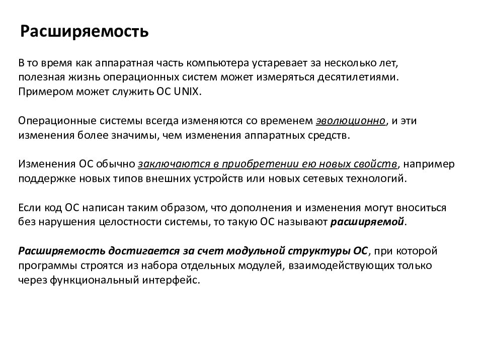 В то время как аппаратная часть компьютера устаревает за несколько лет, полезная жизнь операционных систем может измеряться десятилетиями. Примером может служить ОС UNIX. Операционные системы всегда изменяются со временем эволюционно, и эти изменения более значимы, чем изменения аппаратных средств. Изменения ОС обычно заключаются в приобретении ею новых свойств, например поддержке новых типов внешних устройств или новых сетевых технологий. Если код ОС написан таким образом, что дополнения и изменения могут вноситься без нарушения целостности системы, то такую ОС называют расширяемой. Расширяемость достигается за счет модульной структуры ОС, при которой программы строятся из набора отдельных модулей, взаимодействующих только через функциональный интерфейс.