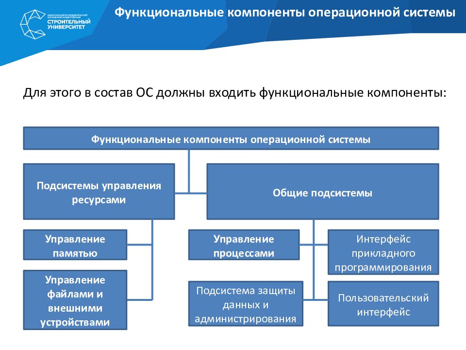 Функциональные компоненты операционной системы Для этого в состав ОС должны входить функциональные компоненты: Функциональные компоненты операционной системы Подсистемы управления ресурсами Общие подсистемы Управление процессами Управление памятью Управление файлами и внешними устройствами Подсистема защиты данных и администрирования Интерфейс прикладного программирования Пользовательский интерфейс