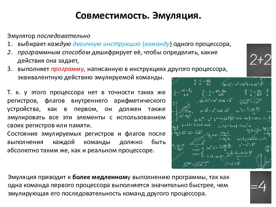 Эмулятор последовательно выбирает каждую двоичную инструкцию ( команду ) одного процессора, программным способом дешифрирует её, чтобы определить, какие действия она задает, выполняет программу, написанную в инструкциях другого процессора, эквивалентную действию эмулируемой команды. Т. к. у этого процессора нет в точности таких же регистров, флагов внутреннего арифметического устройства, как в первом, он должен также эмулировать все эти элементы с использованием своих регистров или памяти. Состояние эмулируемых регистров и флагов после выполнения каждой команды должно быть абсолютно таким же, как и реальном процессоре. Эмуляция приводит к более медленном у выполнению программы, так как одна команда первого процессора выполняется значительно быстрее, чем эмулирующая его последовательность команд другого процессора.