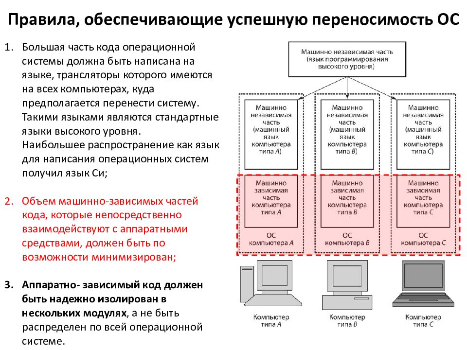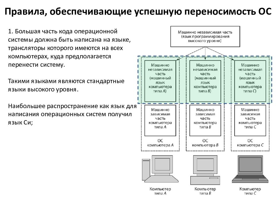 Большая часть кода операционной системы должна быть написана на языке, трансляторы которого имеются на всех компьютерах, куда предполагается перенести систему. Такими языками являются стандартные языки высокого уровня. Наибольшее распространение как язык для написания операционных систем получил язык Си ; Объем машинно-зависимых частей кода, которые непосредственно взаимодействуют с аппаратными средствами, должен быть по возможности минимизирован; Аппаратно- зависимый код должен быть надежно изолирован в нескольких модулях, а не быть распределен по всей операционной системе.