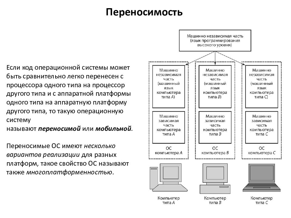 Если код операционной системы может быть сравнительно легко перенесен с процессора одного типа на процессор другого типа и с аппаратной платформы одного типа на аппаратную платформу другого типа, то такую операционную систему называют переносимой или мобильной. Переносимые ОС имеют несколько вариантов реализации для разных платформ, такое свойство ОС называют также многоплатформенностью.