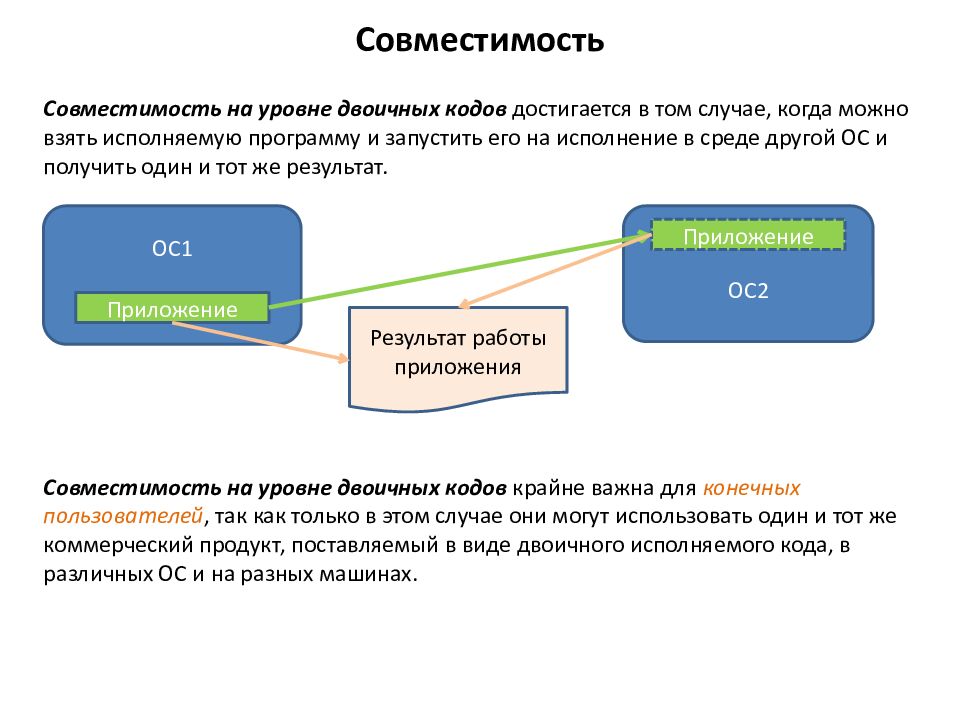 Совместимость на уровне двоичных кодов достигается в том случае, когда можно взять исполняемую программу и запустить его на исполнение в среде другой ОС и получить один и тот же результат. Совместимость на уровне двоичных кодов крайне важна для конечных пользователей, так как только в этом случае они могут использовать один и тот же коммерческий продукт, поставляемый в виде двоичного исполняемого кода, в различных ОС и на разных машинах. ОС1 ОС2 Приложение Приложение Результат работы приложения