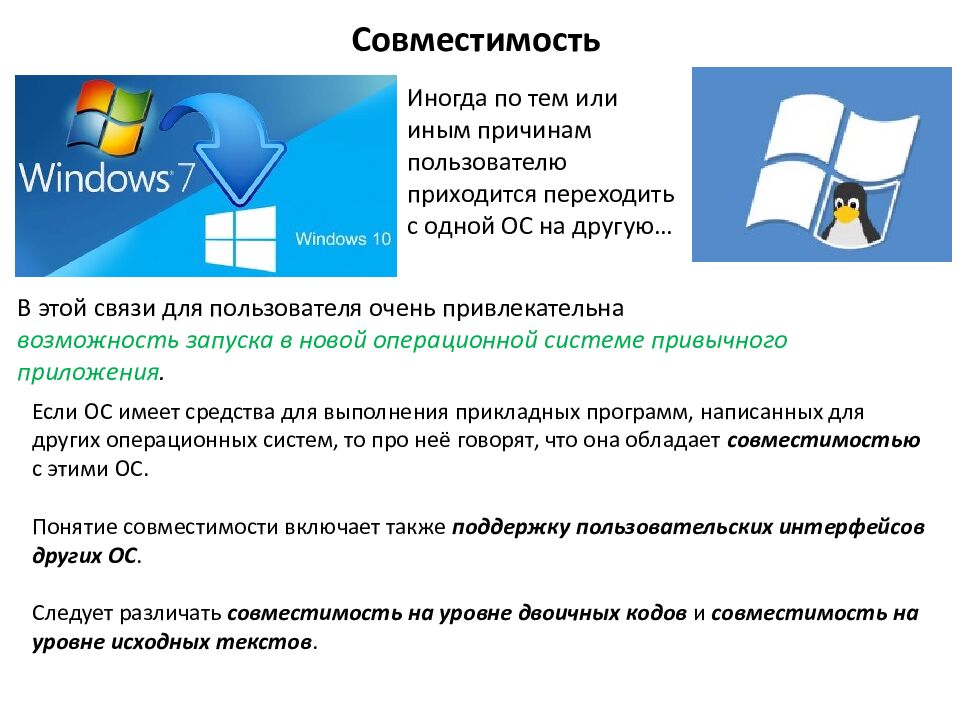 Иногда по тем или иным причинам пользователю приходится переходить с одной ОС на другую… Если ОС имеет средства для выполнения прикладных программ, написанных для других операционных систем, то про неё говорят, что она обладает совместимостью с этими ОС. Понятие совместимости включает также поддержку пользовательских интерфейсов других ОС. Следует различать совместимость на уровне двоичных кодов и совместимость на уровне исходных текстов. В этой связи для пользователя очень привлекательна возможность запуска в новой операционной системе привычного приложения.