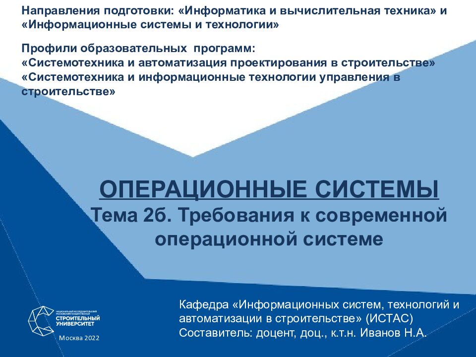 Кафедра «Информационных систем, технологий и автоматизации в строительстве » (ИСТАС) Составитель: доцент, доц., к.т.н. Иванов Н.А. ОПЕРАЦИОННЫЕ СИСТЕМЫ Тема 2б. Требования к современной операционной системе Направления подготовки: «Информатика и вычислительная техника» и «Информационные системы и технологии» Профили образовательных программ: « Системотехника и автоматизация проектирования в строительстве » «Системотехника и информационные технологии управления в строительстве » Москва 2022