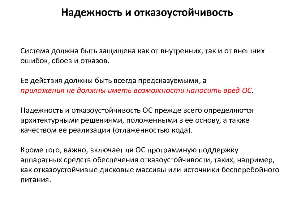 Система должна быть защищена как от внутренних, так и от внешних ошибок, сбоев и отказов. Ее действия должны быть всегда предсказуемыми, а приложения не должны иметь возможности наносить вред ОС. Надежность и отказоустойчивость ОС прежде всего определяются архитектурными решениями, положенными в ее основу, а также качеством ее реализации (отлаженностью кода). Кроме того, важно, включает ли ОС программную поддержку аппаратных средств обеспечения отказоустойчивости, таких, например, как отказоустойчивые дисковые массивы или источники бесперебойного питания.