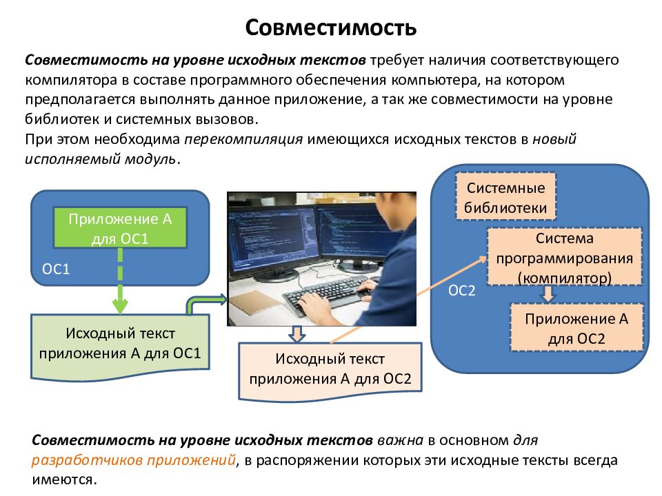 Совместимость на уровне исходных текстов требует наличия соответствующего компилятора в составе программного обеспечения компьютера, на котором предполагается выполнять данное приложение, а так же совместимости на уровне библиотек и системных вызовов. При этом необходима перекомпиляция имеющихся исходных текстов в новый исполняемый модуль. Совместимость на уровне исходных текстов важна в основном для разработчиков приложений, в распоряжении которых эти исходные тексты всегда имеются. ОС1 ОС2 Приложение А для ОС1 Приложение А для ОС2 Исходный текст приложения А для ОС2 Исходный текст приложения А для ОС1 Системные библиотеки Система программирования (компилятор)