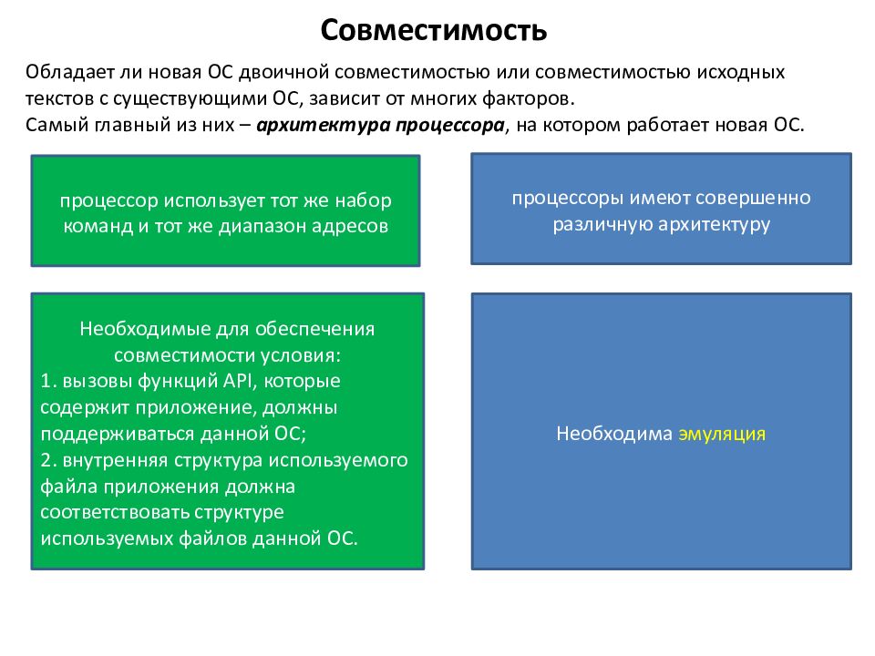 Обладает ли новая ОС двоичной совместимостью или совместимостью исходных текстов с существующими ОС, зависит от многих факторов. Самый главный из них – архитектура процессора, на котором работает новая ОС. процессор использует тот же набор команд и тот же диапазон адресов Необходимые для обеспечения совместимости условия: 1. вызовы функций API, которые содержит приложение, должны поддерживаться данной ОС; 2. внутренняя структура используемого файла приложения должна соответствовать структуре используемых файлов данной ОС. процессоры имеют совершенно различную архитектуру Необходима эмуляция