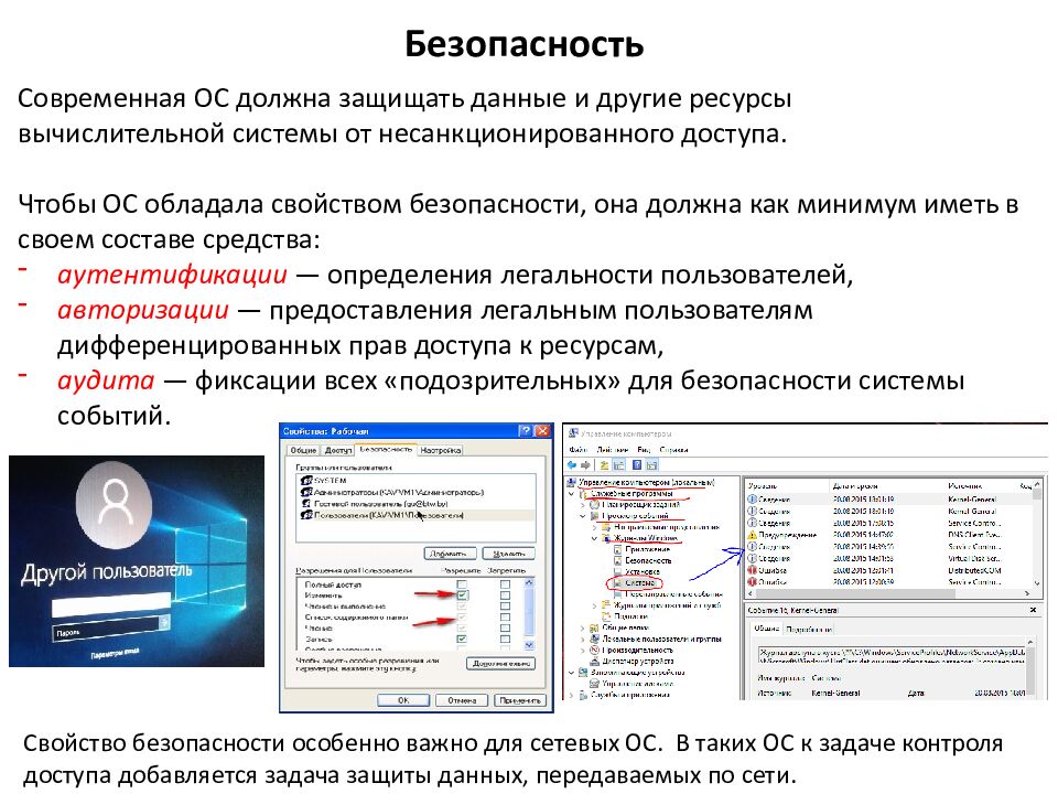 Современная ОС должна защищать данные и другие ресурсы вычислительной системы от несанкционированного доступа. Чтобы ОС обладала свойством безопасности, она должна как минимум иметь в своем составе средства: аутентификации — определения легальности пользователей, авторизации — предоставления легальным пользователям дифференцированных прав доступа к ресурсам, аудита — фиксации всех «подозрительных» для безопасности системы событий. Свойство безопасности особенно важно для сетевых ОС. В таких ОС к задаче контроля доступа добавляется задача защиты данных, передаваемых по сети.