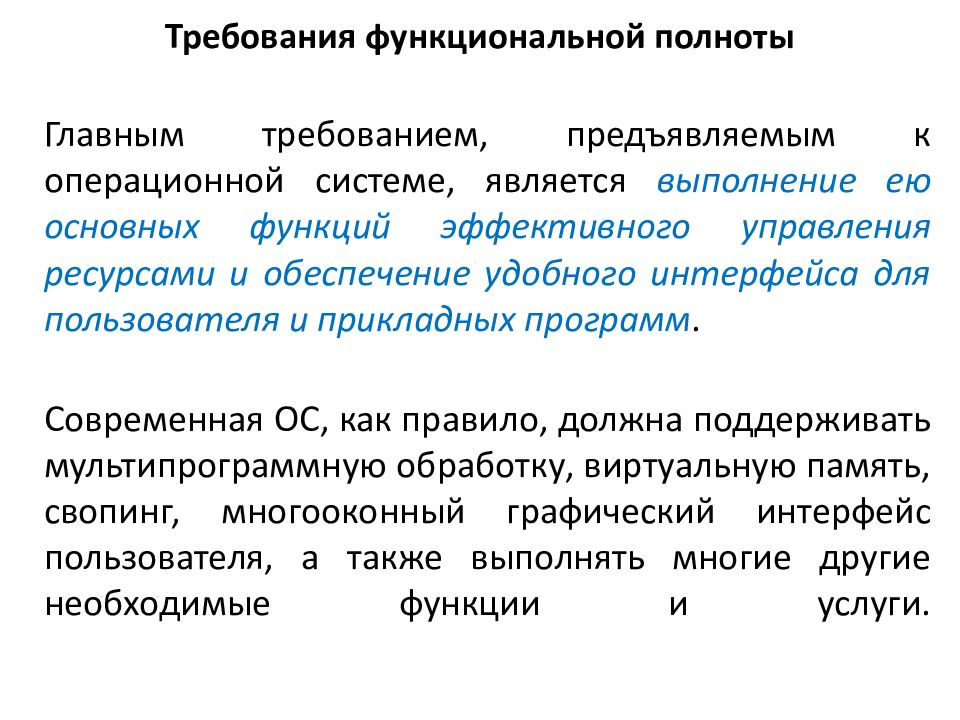 Требования к современным ОС Требования функциональной полноты Эксплуатационные требования