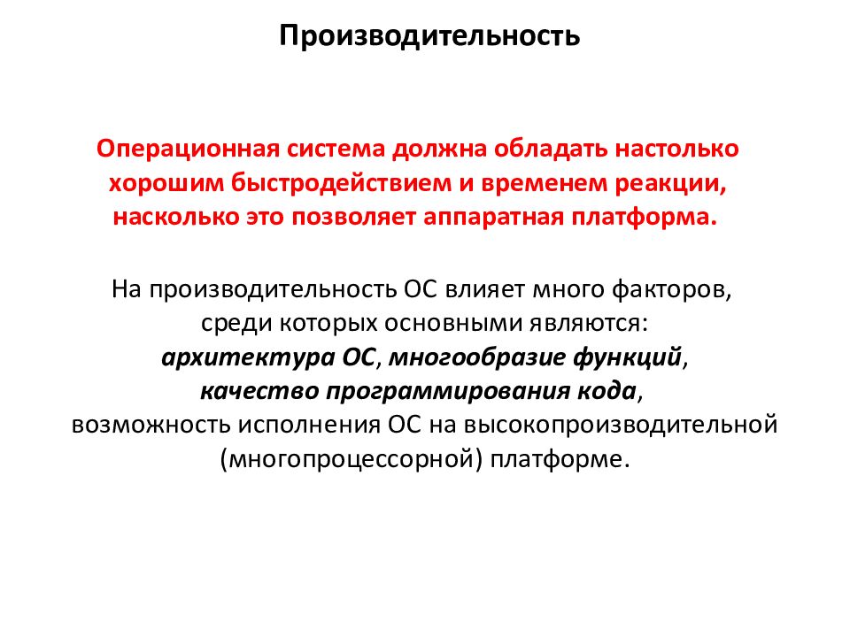 Операционная система должна обладать настолько хорошим быстродействием и временем реакции, насколько это позволяет аппаратная платформа. На производительность ОС влияет много факторов, среди которых основными являются: архитектура ОС, многообразие функций, качество программирования кода, возможность исполнения ОС на высокопроизводительной (многопроцессорной) платформе.