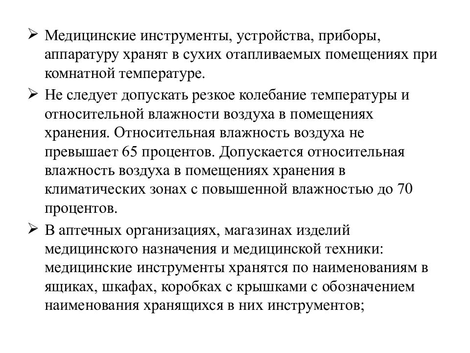 Медицинские инструменты, устройства, приборы, аппаратуру хранят в сухих отапливаемых помещениях при комнатной температуре. Не следует допускать резкое колебание температуры и относительной влажности воздуха в помещениях хранения. Относительная влажность воздуха не превышает 65 процентов. Допускается относительная влажность воздуха в помещениях хранения в климатических зонах с повышенной влажностью до 70 процентов. В аптечных организациях, магазинах изделий медицинского назначения и медицинской техники: медицинские инструменты хранятся по наименованиям в ящиках, шкафах, коробках с крышками с обозначением наименования хранящихся в них инструментов;