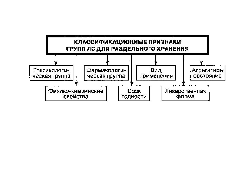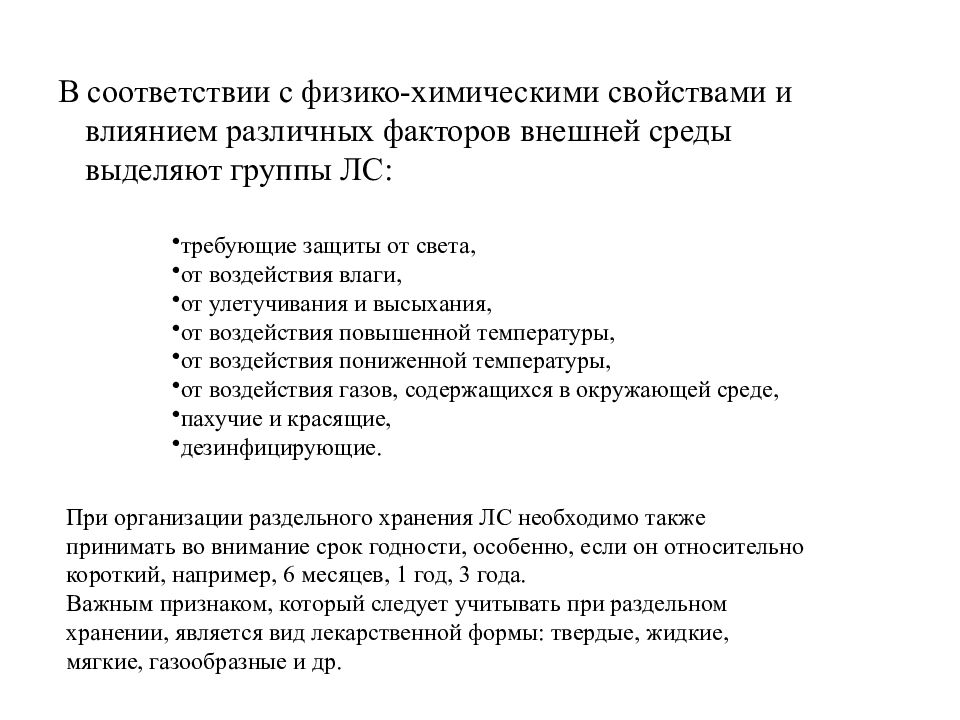 В соответствии с физико-химическими свойствами и влиянием различных факторов внешней среды выделяют группы ЛС: При организации раздельного хранения ЛС необходимо также принимать во внимание срок годности, особенно, если он относительно короткий, например, 6 месяцев, 1 год, 3 года. Важным признаком, который следует учитывать при раздельном хранении, является вид лекарственной формы: твердые, жидкие, мягкие, газообразные и др. требующие защиты от света, от воздействия влаги, от улетучивания и высыхания, от воздействия повышенной температуры, от воздействия пониженной температуры, от воздействия газов, содержащихся в окружающей среде, пахучие и красящие, дезинфицирующие.