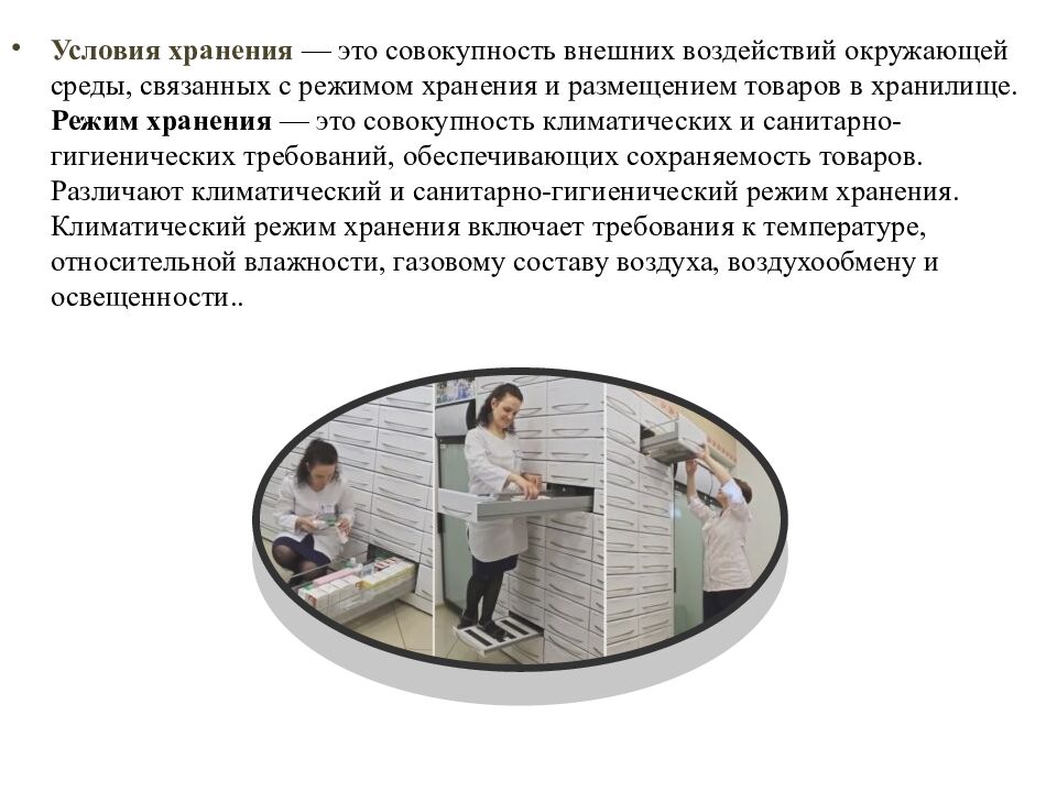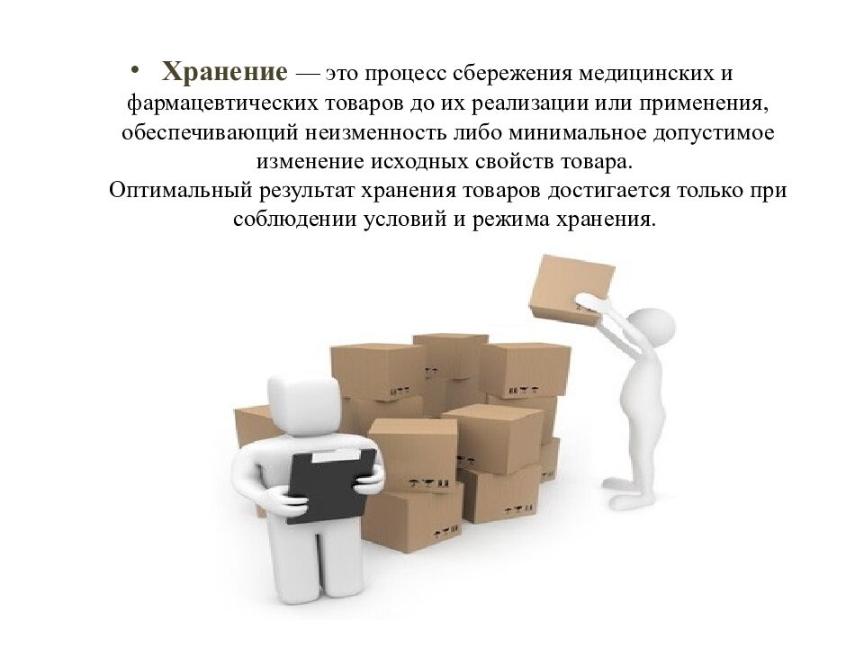 Хранение — это процесс сбережения медицинских и фармацевтических товаров до их реализации или применения, обеспечивающий неизменность либо минимальное допустимое изменение исходных свойств товара. Оптимальный результат хранения товаров достигается только при соблюдении условий и режима хранения.