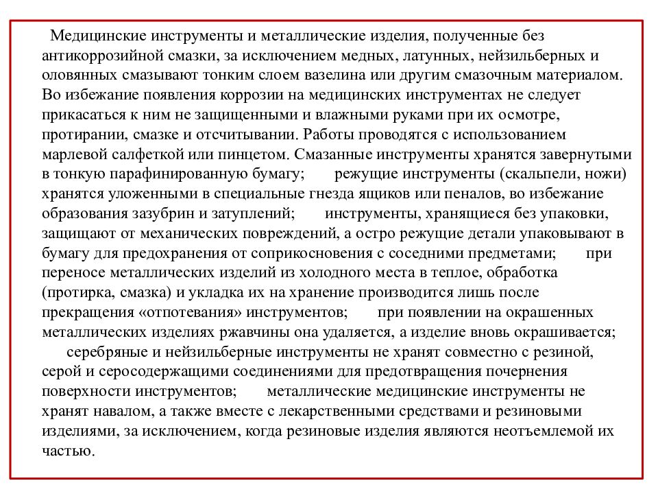 Медицинские инструменты и металлические изделия, полученные без антикоррозийной смазки, за исключением медных, латунных, нейзильберных и оловянных смазывают тонким слоем вазелина или другим смазочным материалом. Во избежание появления коррозии на медицинских инструментах не следует прикасаться к ним не защищенными и влажными руками при их осмотре, протирании, смазке и отсчитывании. Работы проводятся с использованием марлевой салфеткой или пинцетом. Смазанные инструменты хранятся завернутыми в тонкую парафинированную бумагу; режущие инструменты (скальпели, ножи) хранятся уложенными в специальные гнезда ящиков или пеналов, во избежание образования зазубрин и затуплений ; инструменты, хранящиеся без упаковки, защищают от механических повреждений, а остро режущие детали упаковывают в бумагу для предохранения от соприкосновения с соседними предметами; при переносе металлических изделий из холодного места в теплое, обработка (протирка, смазка) и укладка их на хранение производится лишь после прекращения «отпотевания» инструментов; при появлении на окрашенных металлических изделиях ржавчины она удаляется, а изделие вновь окрашивается; серебряные и нейзильберные инструменты не хранят совместно с резиной, серой и серосодержащими соединениями для предотвращения почернения поверхности инструментов; металлические медицинские инструменты не хранят навалом, а также вместе с лекарственными средствами и резиновыми изделиями, за исключением, когда резиновые изделия являются неотъемлемой их частью.