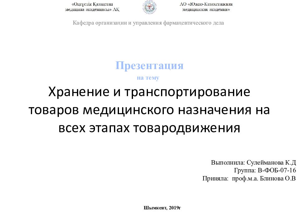Выполнила: Сулейманова К.Д Группа: В-ФОБ-07-16 Приняла: проф.м.а. Блинова О.В Шымкент, 2019г Презентация на тему Хранение и транспортирование товаров медицинского назначения на всех этапах товародвижения