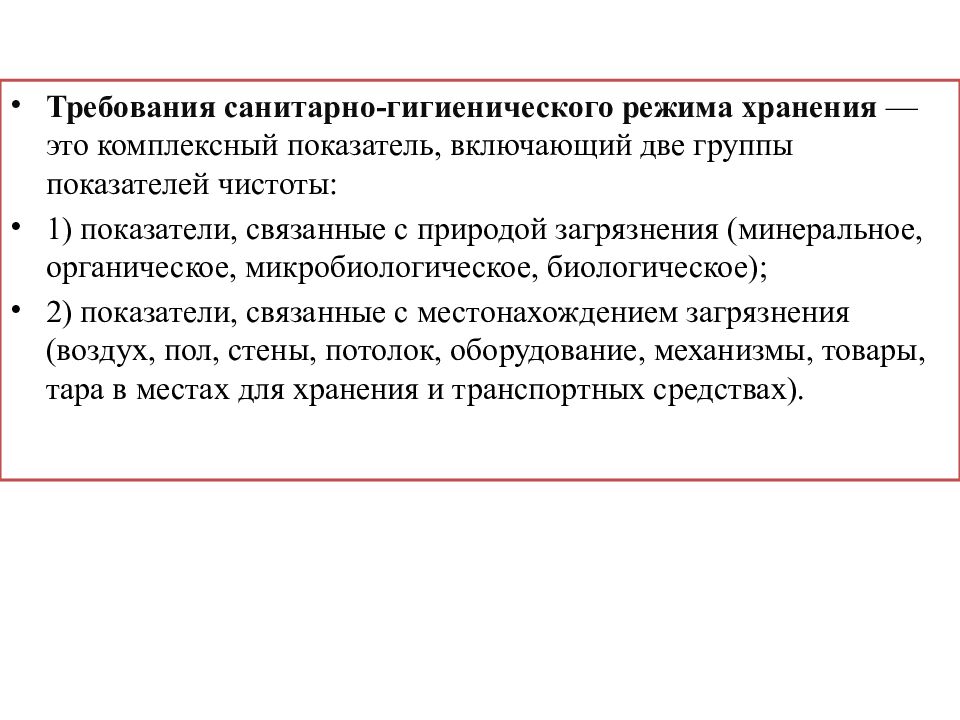 Требования санитарно-гигиенического режима хранения — это комплексный показатель, включающий две группы показателей чистоты: 1) показатели, связанные с природой загрязнения (минеральное, органическое, микробиологическое, биологическое); 2) показатели, связанные с местонахождением загрязнения (воздух, пол, стены, потолок, оборудование, механизмы, товары, тара в местах для хранения и транспортных средствах).