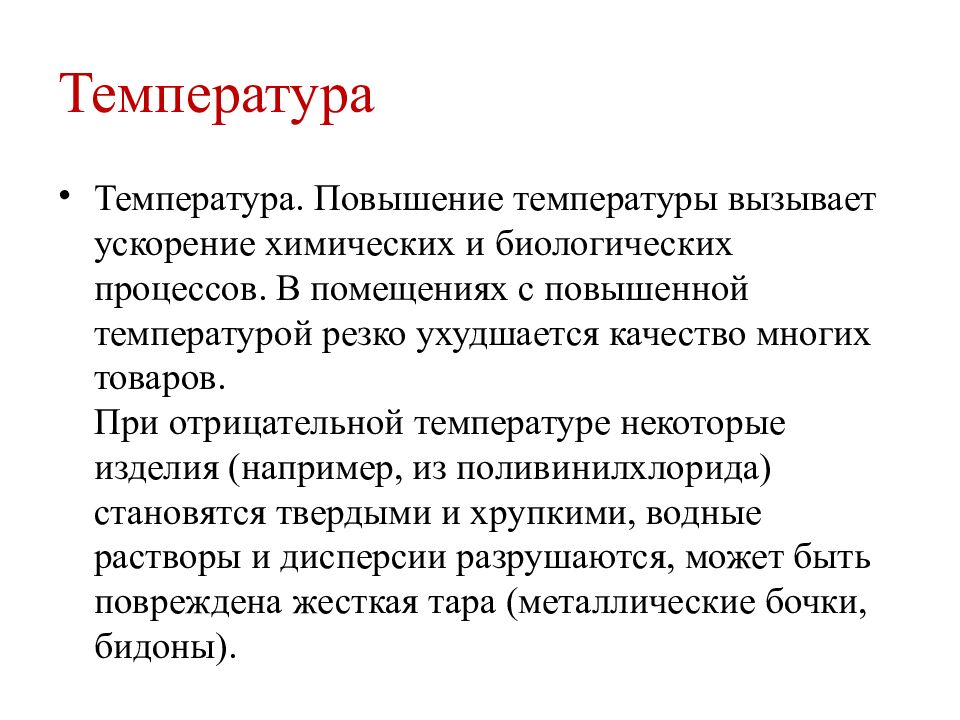 Температура. Повышение температуры вызывает ускорение химических и биологических процессов. В помещениях с повышенной температурой резко ухудшается качество многих товаров. При отрицательной температуре некоторые изделия (например, из поливинилхлорида) становятся твердыми и хрупкими, водные растворы и дисперсии разрушаются, может быть повреждена жесткая тара (металлические бочки, бидоны).