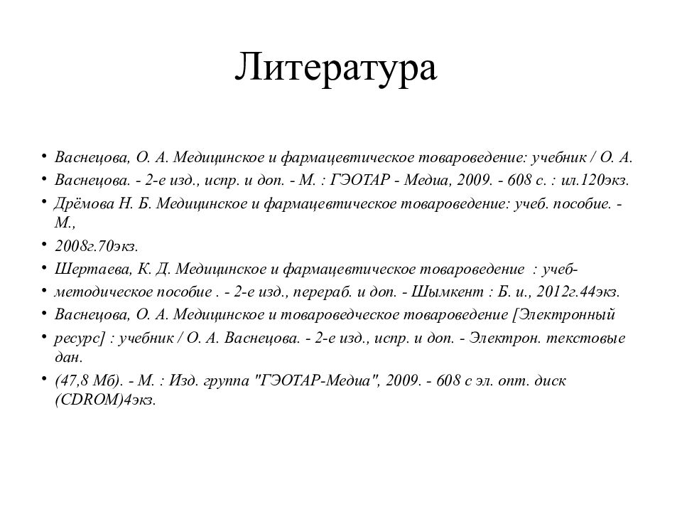 Васнецова, О. А. Медицинское и фармацевтическое товароведение: учебник / О. А. Васнецова. - 2-е изд., испр. и доп. - М. : ГЭОТАР - Медиа, 2009. - 608 с. : ил.120экз. Дрёмова Н. Б. Медицинское и фармацевтическое товароведение: учеб. пособие. - М., 2008г.70экз. Шертаева, К. Д. Медицинское и фармацевтическое товароведение : учеб- методическое пособие. - 2-е изд., перераб. и доп. - Шымкент : Б. и., 2012г.44экз. Васнецова, О. А. Медицинское и товароведческое товароведение [Электронный ресурс] : учебник / О. А. Васнецова. - 2-е изд., испр. и доп. - Электрон. текстовые дан. (47,8 Мб). - М. : Изд. группа " ГЭОТАР-Медиа ", 2009. - 608 с эл. опт. диск (CDROM)4экз.
