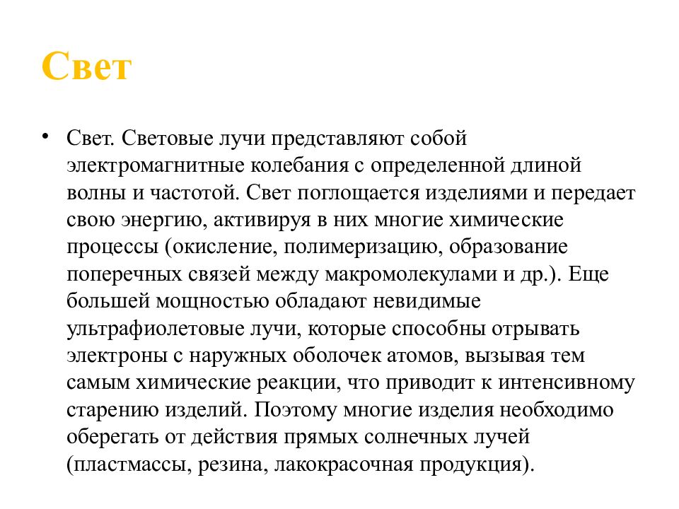 Свет. Световые лучи представляют собой электромагнитные колебания с определенной длиной волны и частотой. Свет поглощается изделиями и передает свою энергию, активируя в них многие химические процессы (окисление, полимеризацию, образование поперечных связей между макромолекулами и др.). Еще большей мощностью обладают невидимые ультрафиолетовые лучи, которые способны отрывать электроны с наружных оболочек атомов, вызывая тем самым химические реакции, что приводит к интенсивному старению изделий. Поэтому многие изделия необходимо оберегать от действия прямых солнечных лучей (пластмассы, резина, лакокрасочная продукция).