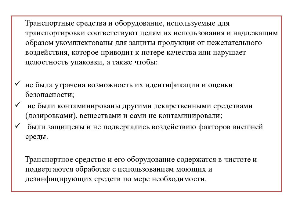 Транспортные средства и оборудование, используемые для транспортировки соответствуют целям их использования и надлежащим образом укомплектованы для защиты продукции от нежелательного воздействия, которое приводит к потере качества или нарушает целостность упаковки, а также чтобы: не была утрачена возможность их идентификации и оценки безопасности; не были контаминированы другими лекарственными средствами (дозировками), веществами и сами не контаминировали ; были защищены и не подвергались воздействию факторов внешней среды. Транспортное средство и его оборудование содержатся в чистоте и подвергаются обработке с использованием моющих и дезинфицирующих средств по мере необходимости.