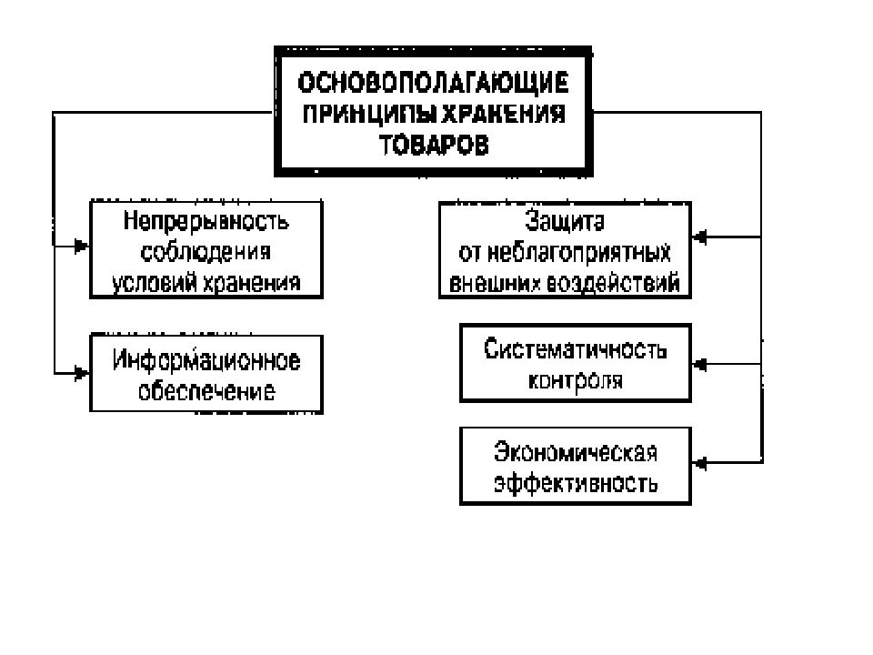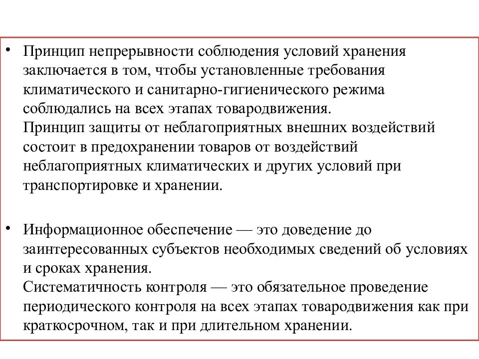 Принцип непрерывности соблюдения условий хранения заключается в том, чтобы установленные требования климатического и санитарно-гигиенического режима соблюдались на всех этапах товародвижения. Принцип защиты от неблагоприятных внешних воздействий состоит в предохранении товаров от воздействий неблагоприятных климатических и других условий при транспортировке и хранении. Информационное обеспечение — это доведение до заинтересованных субъектов необходимых сведений об условиях и сроках хранения. Систематичность контроля — это обязательное проведение периодического контроля на всех этапах товародвижения как при краткосрочном, так и при длительном хранении.