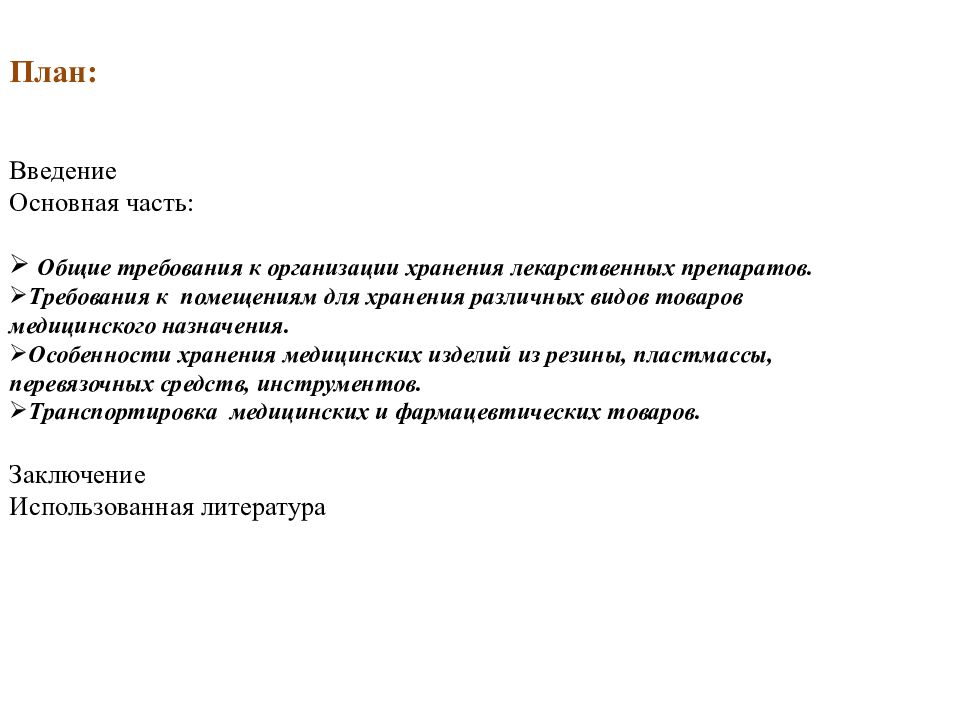 План: Введение Основная часть: Общие требования к организации хранения лекарственных препаратов. Требования к помещениям для хранения различных видов товаров медицинского назначения. Особенности хранения медицинских изделий из резины, пластмассы, перевязочных средств, инструментов. Транспортировка медицинских и фармацевтических товаров. Заключение Использованная литература